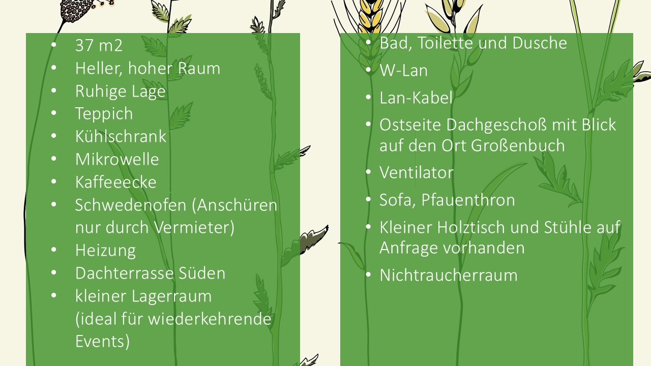 Du bist auf der Suche nach einem Raum für kleine Veranstaltungen, diversen Kursen, homeoffice oder einfach mal eine Auszeit? Für ein paar Stunden, ganztags oder über einem längeren Zeitraum?